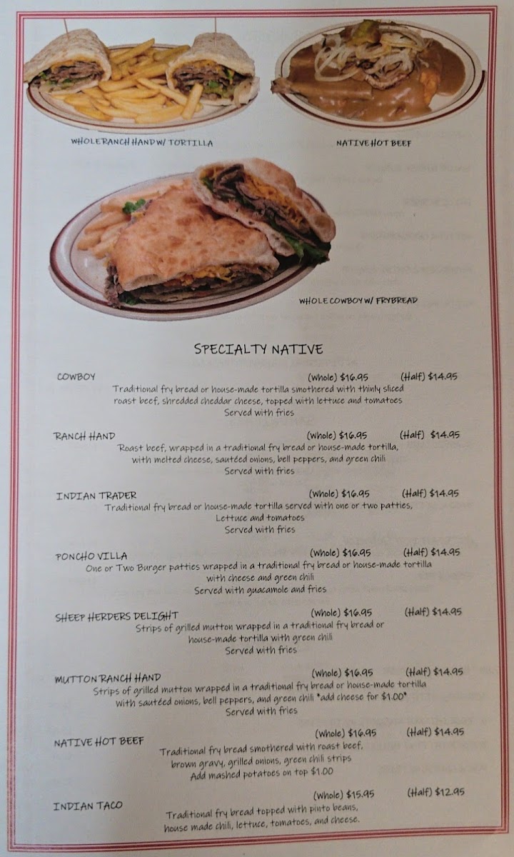 The Specialty Native section of the menu features unique options inspired by the local culture, such as the Cowboy, Ranch Hand, and Indian Trader dishes. If you're in the mood for something bold, try the Poncho Villa or Sheep Herders Delight, which combine savory ingredients for a filling meal.