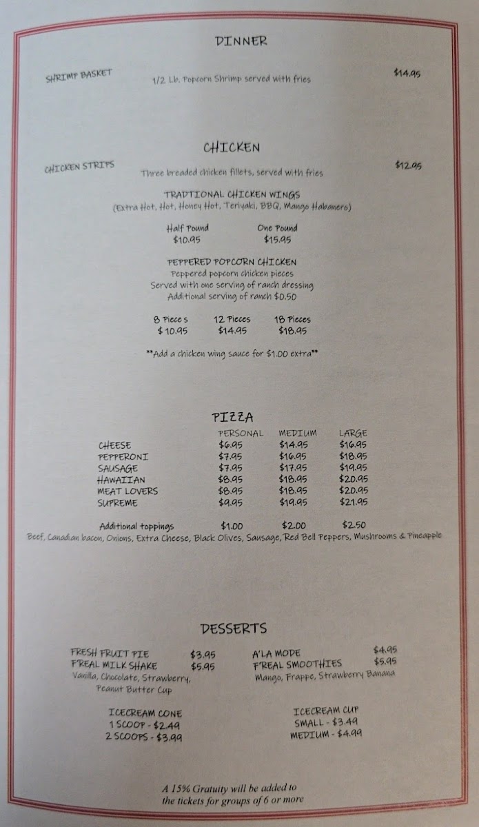 For dinner, the Shrimp Basket and Traditional Chicken Wings are fantastic choices for seafood and chicken lovers. If you're craving something a bit different, the Peppered Popcorn Chicken is a flavorful and crispy option.